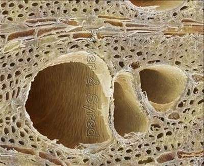 وهذ صورة السابقة هلي صورة مكبرة لمقطع خشبي، و نلاحظ أنه يحوي مسامات و فراغات تشبه تركيب العظام ، و هذا التشابه لفت انتباه الباحثين لإمكانية تصنيع العظام من هذه المادة .