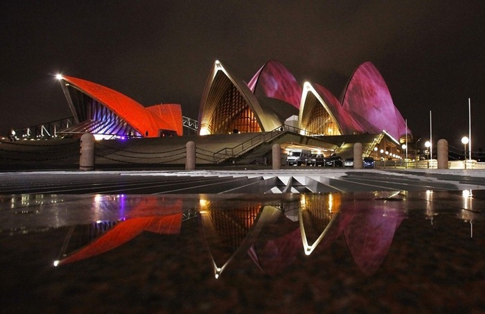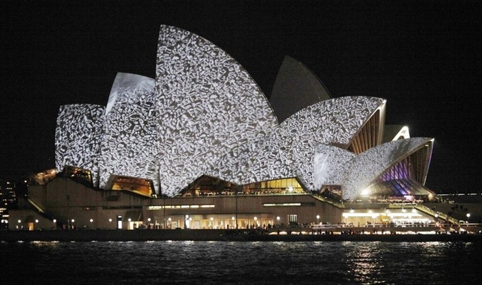 أحد مباني سيدني تظهر و كأن لونها اخضر ممزوج بألوان اخري و عليه بعض الكتابة ولكن في حقيقة الامر ان كل هذا باستخدام الضوء فقط و المبني هو مبني كأي مبني في المدينه لا يوجد به مثل هذه الألوان و الكتابات .