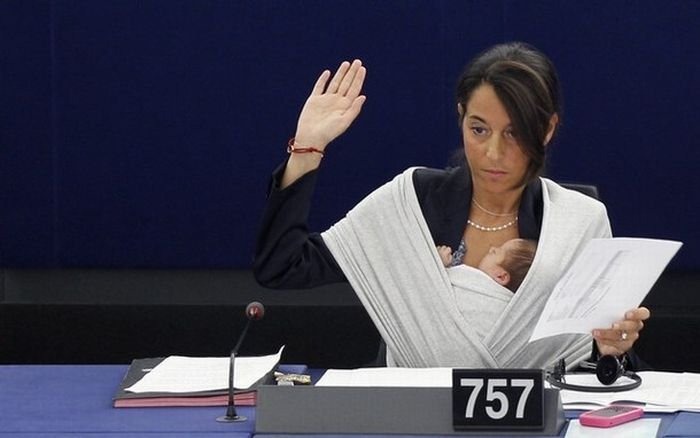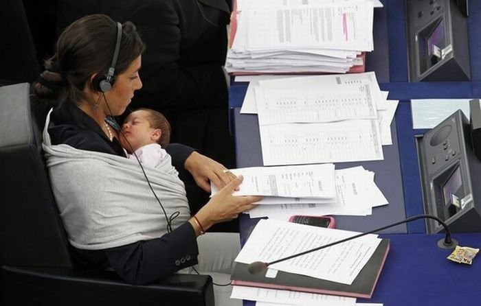 أصطحبت عضوة في البرلمان الأوروبي رضيعتها معها إلي أحد جلسات البرلمان و تابعت عملها في صمت ، فكونها عضوة في البرلمان لا تستطيع أن تهمل شئون بلادها بسبب مولودها ، كما انها لا تسطيع أن تهمل رضيعها بسبب بلادها .