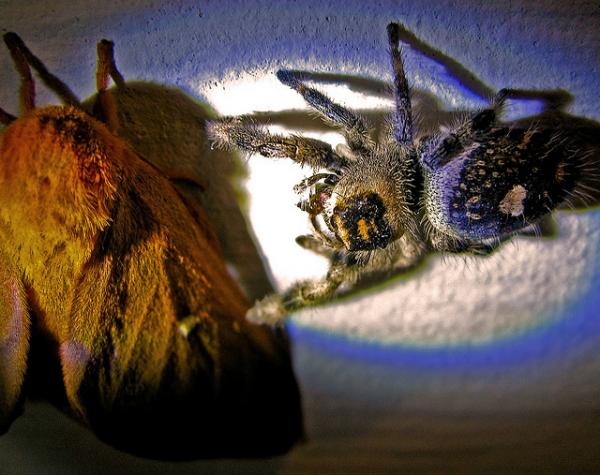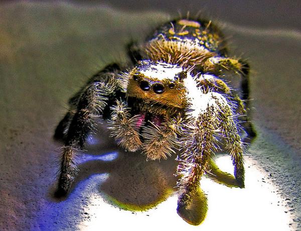 الصياد متحكم في صف من العيون على راسه. هذه العينة الشرسة هو العنكبوت القفَّاز وبالرغم من انه هناك بعض الاستثناءات في العناكب الا ان العنكبوت القفَّاز لا ينسج الشباك وينتظر الفريسة ولكنه عندما يحتاج الى وجبة يكون اكثر ابداعًا فهو يتتبع فريسته خطوة بخطوة ثم يستغل اللحظة المناسبة ويقفز عليها يمكنه ان يقفز مسافة 40 مرة طول جسمه