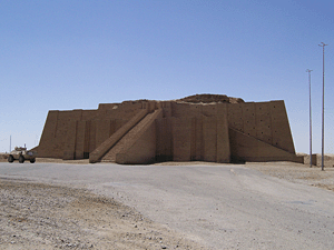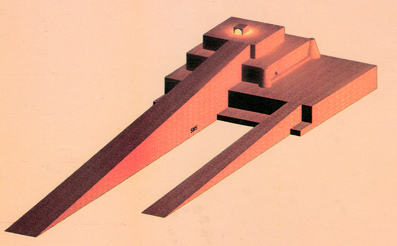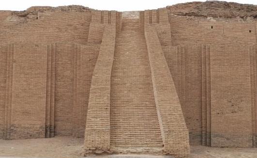 وقد وجد وولي مبنى هرمي مستطيل ضخم يتكون من 3 درجات بارتفاع من 70 الى 100 قدم يحتوي على 3 مجموعات مختلفة من السلالم المجموعة الاولى تقود الى البوابة في الطابق الاول والثانية تقود الى البوابو في الطابق الثاني والمدعم بمنصة تقود الىالمعبد والطابق الاخير
