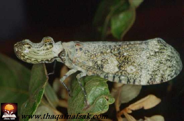 هي حشرةغريبة الشكل . يبرز من رأسها نتوء يشبه حبة الفول السوداني الغير مقشرة . هذه الحشرة مسالمة لذلك أعطاها الله ترسانة من أسلحة التضليل والدفاع عن النفس سواء رأسها الذي يعتقد العلماء بأنه بهذا الشكل ليُحاكي فم السحاليلتردع الحيوانات المفترسةأو أجنحتها التي تحمل بُقعاََ تشبه عين البومه .
