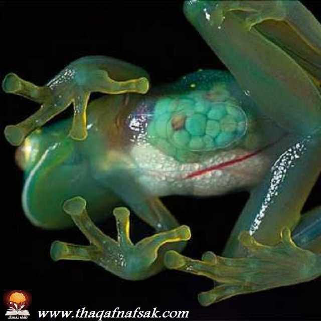 هذه الضفادع جسمها شفاف كلياََ سامحاََ لك برؤية أعضائها الداخلية . الجسم يأخذ لون النباتات جاعلاََ من الصعب رؤية هذه الضفادع .