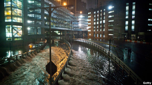و تلك صورة لأحد شوارع منهاتن في المناطق المنخفضة ، والتي تحولت لأنهار مع اقتراب العاصفة ساندي من نيويورك .