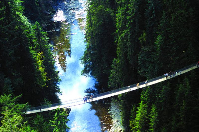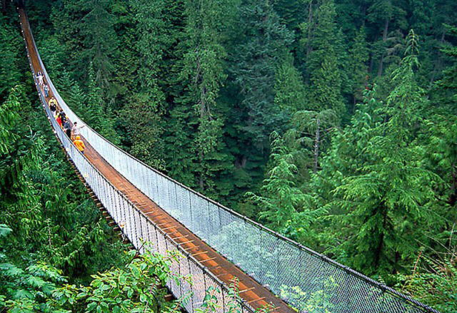 الجسر المعلق يمتد عبر 450 قدم و 230 قدم فوق نهر كابيلانو في فانكوفر الشمالية . ولكن لا تقلق، على الرغم من أنه يترنح ويصدرصرير، إلا انه قوي جدا جدا. قوي بما يكفي لدعم وزن عشرة من الطائرات المقاتلة العسكرية . قوي بما يكفي للتعامل مع الزوار حوالي 850000 كل عام. قوي بما يكفي للتعامل حتى لفصل دراسي كامل من طلاب الروضة يمشون جميعا عبر الجسر، سوف يعبرون نهر كابيلانو ويدخلون إلى الجانب الأخر الذي يتمز بغابة كاملة حية .