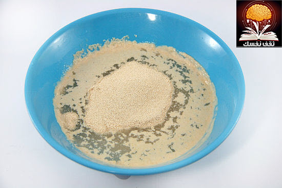 1) في وعاء عميق قم بخلط الماء الدافئ مع الخميرة واستمر في التقليب إلى أن تذوب الخميرة في الماء .