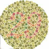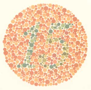 يعتمد اختبار إيشيهارا للألوان على مجموعة من الصورة تحوي بقع ملونة ، وهو الفحص المستخدم بشكل كبير في تشخيص أخطاء رؤية اللون الأخضر-الأحمر. تحتوي الصورة عادة على واحد أو أكثر من الأرقام العربية ملون بلون مختلف عن باقي أجزاء الصورة، ويكون من الممكن مشاهدته من قبل شخص نظره سليم، ولكن ليس من قبل الأشخاص المصابين بعمى الألوان.