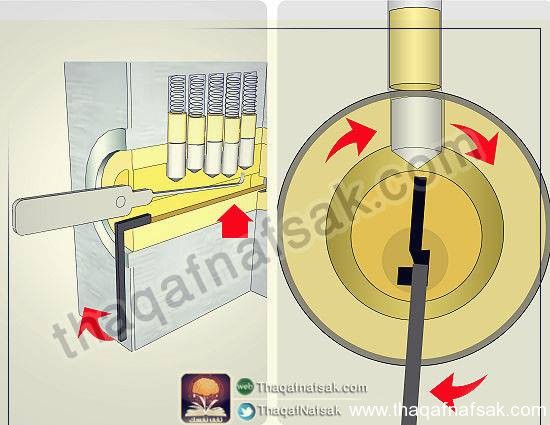 1- عليك فهم كيف يعمل القفل . يتكون القفل من دبوس و ريشة القفل وهي إسطوانه تدور حول السكينة ( إنظر للشكل الموضح ) تتكون الإسطوانه من عدة أزواج من الدبابيس عندما يتم إدخال المفتاح بصورة صحيحة يتم دفع أزواج من الدبابيس بالترتيب وعندما يحدث هذا سيتم فتح القفل .