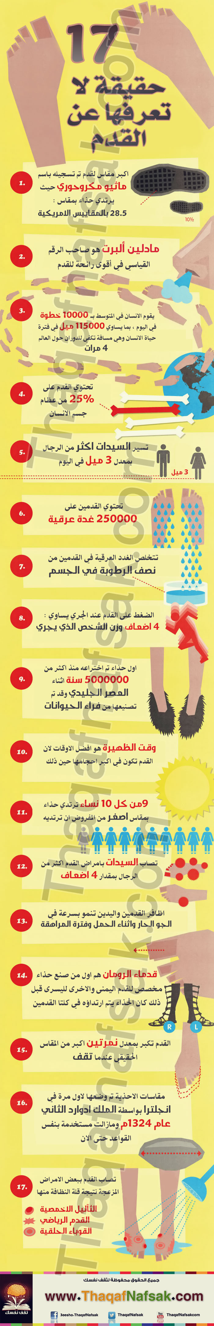 نعرض من خلال الإنفوجرافيك التالي : 17 حقيقة من حقائق عن قدم الإنسان قد لا تعرفها و التي تفيدك في معرفة و فهم طبيعة قدم الإنسان و تعمل من أجل صحتك و راحة قدميك