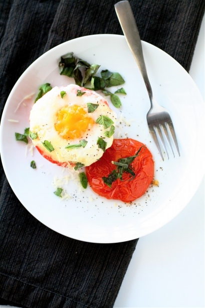 4- قم بكسر البيضة داخل الطماطم بحرص بحيث تبقى كل البيضة على الطماطم