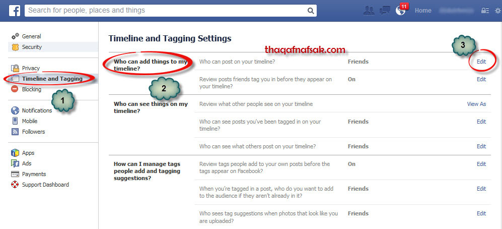 3- ثم من “ من يستطيع إضافة محتوى إلى يومياتي؟ ” أختار ” تعديل “ ( edit)