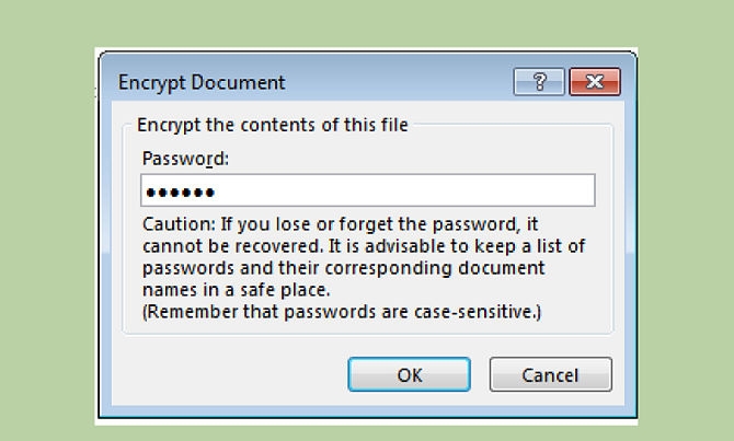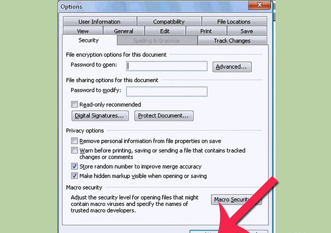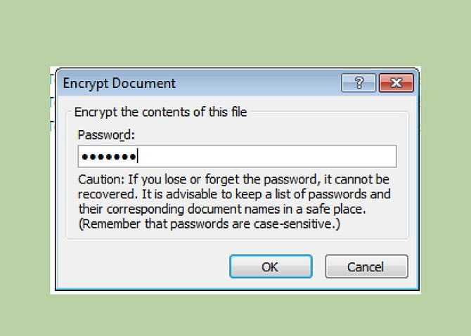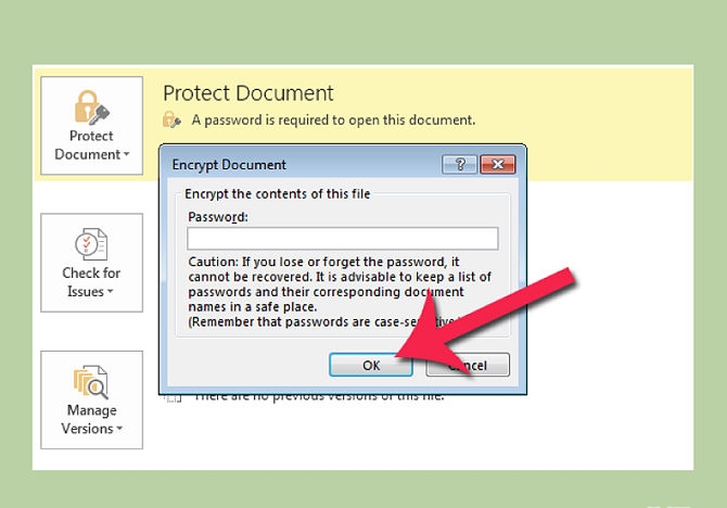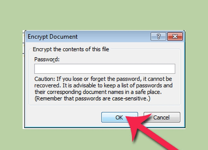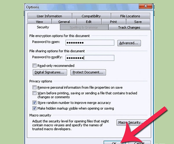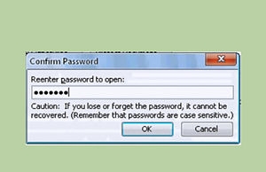 2- ومن security tap قم بإدخال كلمة السر التي تريدها عند password to open واضغط على موافق لحفظ كلمة السر، ولن يكون في استطاعتك أيضا أن تستعيد كلمة السر هذه ولذلك أن تقوم بكتابتها وحفظها في مكان آمن، وسوف يطلب منك البرنامج أن تقوم بكتابة كلمة السر مرة أخرى للتأكيد.