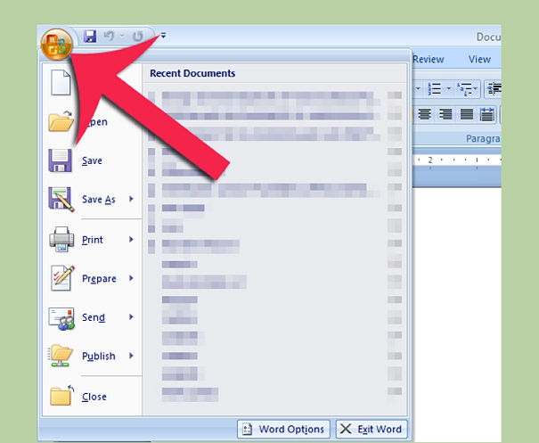 1- اضغط على زر المايكروسوفت أوفيس، وهو الزر الدائري الموجود في الأعلى جهة الشمال، وبالضغط عليه سوف تفتح قائمة تمكنك من حفظ هذه الوثيقة