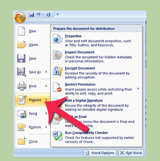2- قف بالماوس على اختيار prepare الموجود في نفس القائمة بين خيارين Print و send وسوف تظهر لك قائمة أخرى