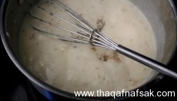 14- وضع حوالي 1/4 كوب من صلصة البشاميل حتي تمتزج جيداً , سوف يتبقي معك حوالي 2 كوب من صلصة الباشميل تستخدم مع السبانخ .
