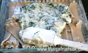 22- إضافة 1/2 كوب من خليط السبانخ و 1/2 كوب من الموتزاريلا علي الطبقة .