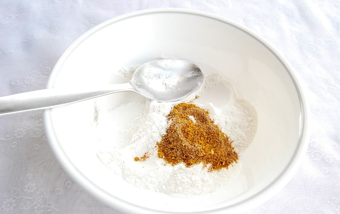 1- قومي بوضع الدقيق والتوابل المطحونة في وعاء صغير