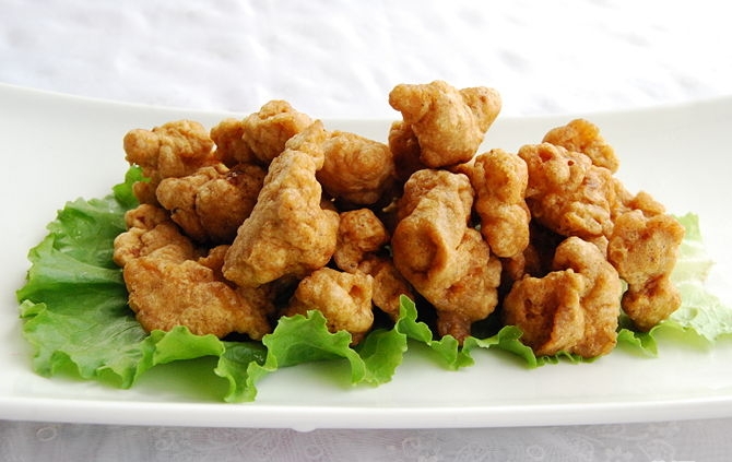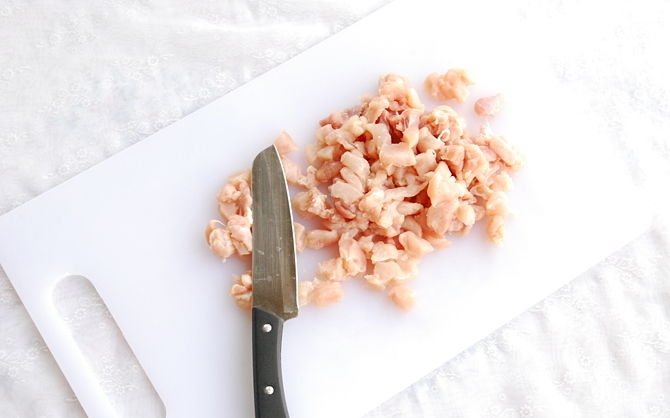 3- قومي بتقطيع صدور الدجاج إلى اجزاء صغيرة جدا تتراوح بين 1 بوصة و 1 ونصف بوصة على حسب درجة القرمشة التي تريدينها واعلمي أنه كلما كان الحجم أصغر كلنا كان مقرمشا أكثر.