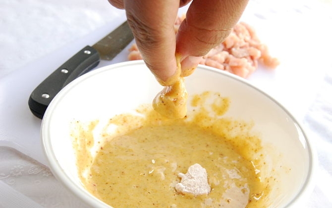6- افعلي ذلك مع كل قطع الدجاج غطيها بالخليط تماما قطعة بقطعة