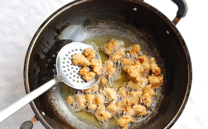 7- تأكدي من أن الزيت قد أصبح جاهزا لوضع قطع الدجاج به لقليه ثم قومي بوضع قطع الدجاج به لمدة 2-3 دقائق ثم قومي بقلبها حيث يجب أن تأخذ قطع الدجاج اللون الذهبي والبني