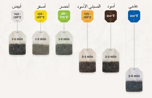 3. انتبه لمدة غمس الشاي ودرجة حرارة المياه في الحقيقة ليس هناك مدة مثالية لغمس الشاي في المياه كما لا توجد درجة حرارة مثالية فمدة غمس الشاي تعتمد على ذوق شارب الشاي فان احس ان طعم الشاي مر يجب ان يقلل من مدة غمس الشاي في المياه الساخنة والعكس صحيح ان كان طعم الشاي خفيف. الصورة في الاسفل توضح درجة حرارة المياه التي يجب ان تكون عند تحضير الشاي