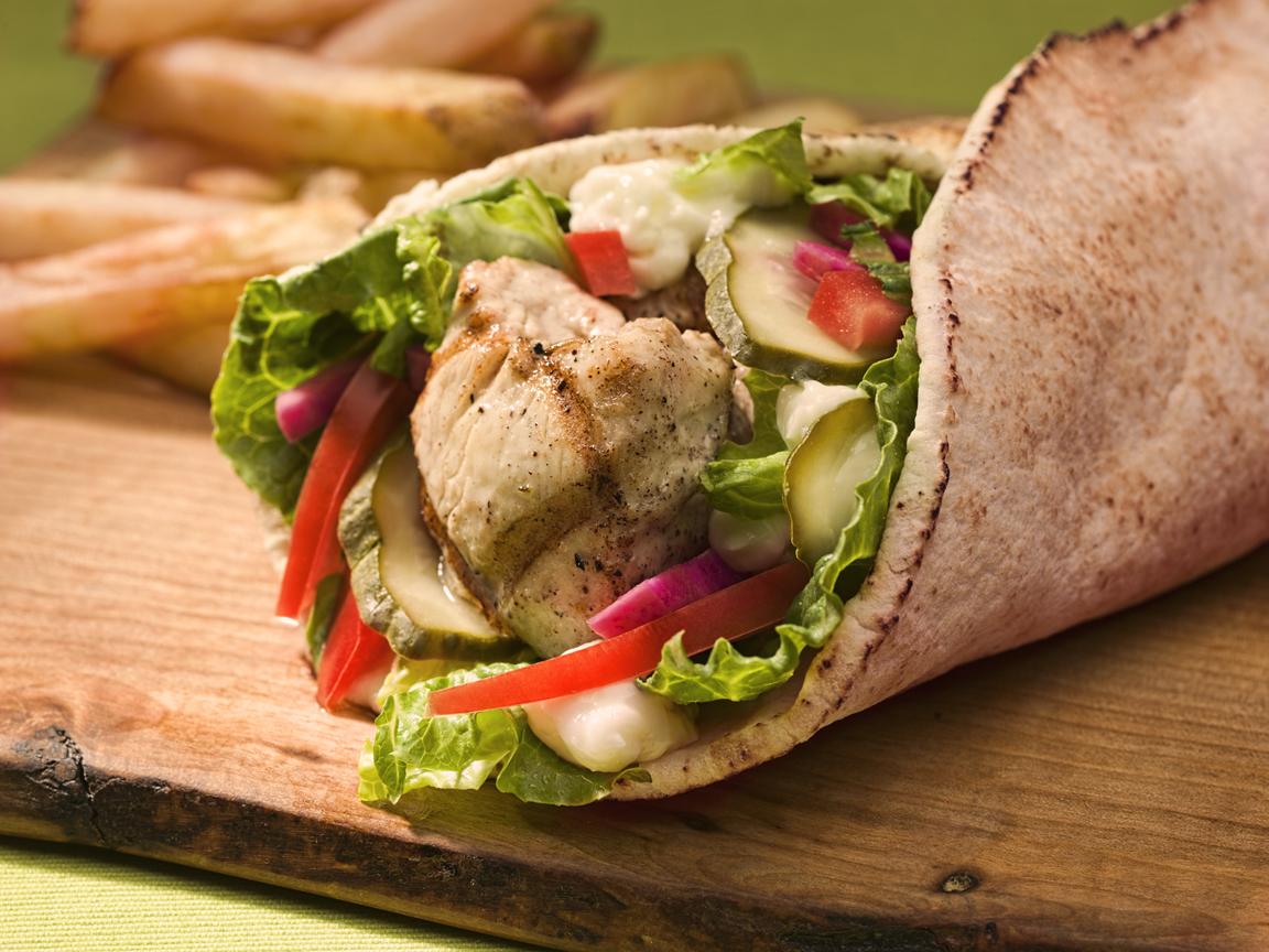 نفتح الخبز ، و البدء في وضع شرائح الطماطم و الثوم و صلصة الطحينة مع إضافة البصل و الدجاج و إضافة شرائح المخلل و البطاطس . ولف الخبز