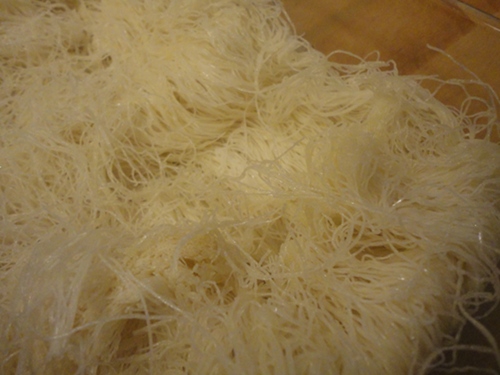 • وضع حوالي عرض ثلاثة أصابع من الكنافة علي معلقة و وضع الحشو في نهاية اللف