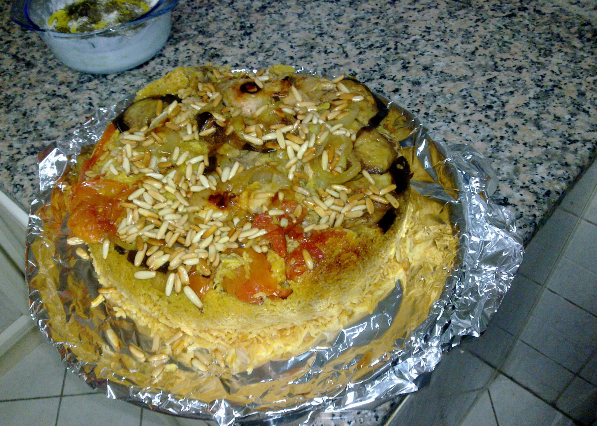 - في مقلاة أخري قم بوضع كل من الأرز و الدجاج و الباذنجان و البطاطس في شكل طبقات كما موضح بالصورة