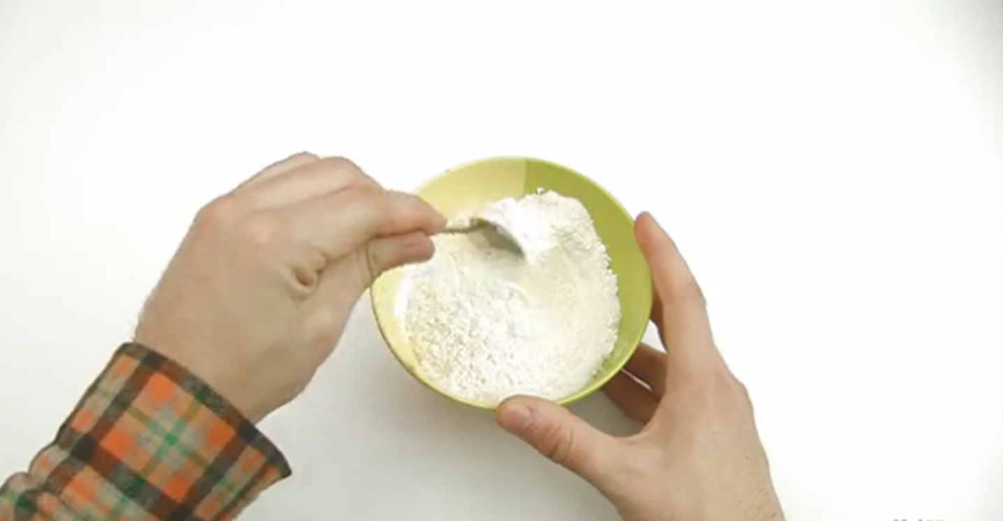 1- قم بمزج المكونات الجافة، قم بإضافة الملح إلى الدقيق في وعاء وقم كذلك بإضافة ملعقة من الشبة مع ملعقتين من كريم التارتار.