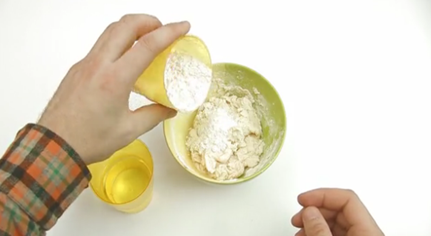3- واضبط العجينة فإذا وجدتا لينة اكثر من اللازم قم بإضافة مزيد من الدقيق وإذا وجدتها جافة أكثر من اللازم ضع المزيد من الماء.