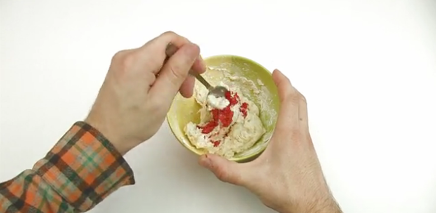 4- وقم بعد ذلك بإضافة اللون والجليتر وقلب حتى يمتزج اللون بالعجينة جيدا.
