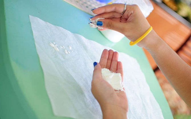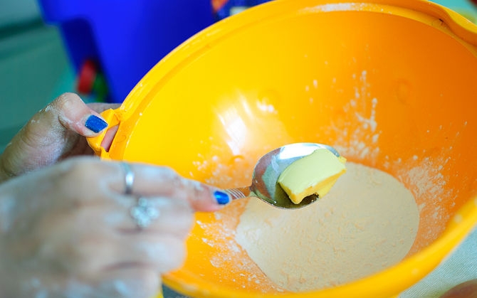 – ثم قم بإضافة الزبدة أو السمن إلى الخليط واستخدم يدك لفركها جيدا ثم امزجها جيدا مع الخليط.