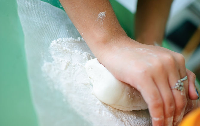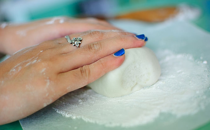 – قم بوضع كرة عجين البسكويت على السطح الذي قمت بإعداده مسبقا في الخطوة الثانية بالسمن والدقيق، واتركها لمدة 5 دقائق، وعندما تصبح العجينة جاهزة قم بعجنها عدة مرات أخرى
