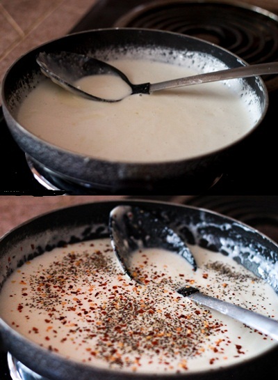 قم مرة أخري نقل الخليط إلي المقلاة ، و إضافة رقائق الفلفل الحار و الفلفل الأسود و الملح .