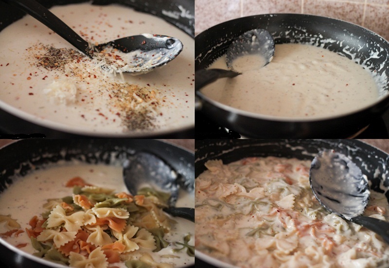 و في المقلاة ، قم بأخذ الصلصة البيضاء و إضافة الجبن و الملح و الفلفل حسب التذوق .ثم إضافة الباستا المطبوخة و الطهي لمدة 5 دقائق .