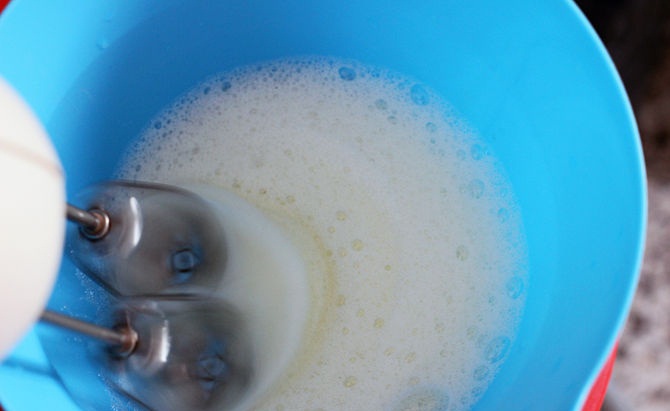 خلط صفار البيض مع البياض في الخلاط علي سرعة عالية حتي يصبح دسم و ثقيل و بعد دقيقة يمكنك إضافة معلقة كبيرة من السكر و الإستمرار في الخلط لبضع دقائق ، حتي يصبح الخليط أكثر سمكاً .