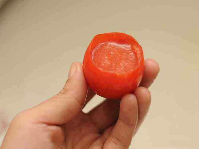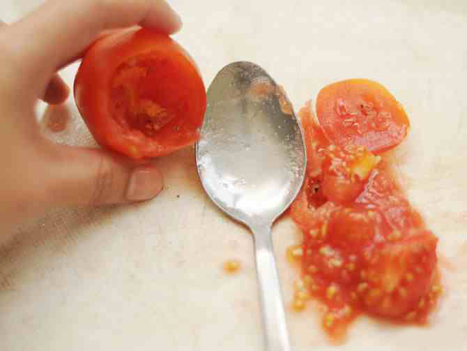 الخطوة 2 : إزالة الجزء العلوي من الطماطم ويستخرج الجزء الداخلي منها ولكن لايتم التخلص منة .