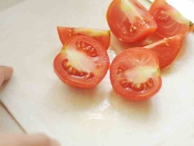 الخطوة 2 : تقطيع الطماطم في أربعة أجزاء كبيرة .
