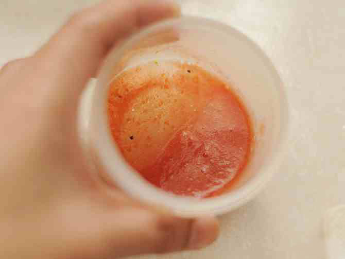 الخطوة 3 : هرس الجزء الداخلي من الطماطم الذي تم استخراجه منها إما عن طريق شوكة أو هراسة البطاطس . تستمر هذه العملية لمدة 15-30 دقيقة لصنع عصير رقيق وحوالي 10-15 دقيقة لصنع عصير كثيف .