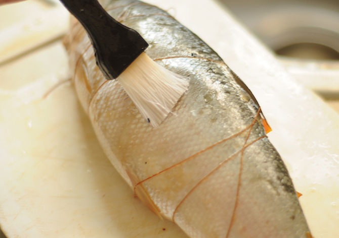 2. عمل خطوط مائلة علي ظهر السمك بحيث تكون شقوق متباعدة حوالي 1 ، 2 بوصة بحيث تحصل علي حوالي 5 خطوط متباعدة علي كل جانب ثم تنظيف السمك من الداخل و قطع الزعانف الحادة بالمقص .