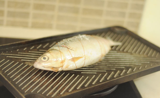 7. تحويل جانب السمك ، يجب قلب السمك بلطف حتي لا يتمزق الجلد بإستخدام معلقة حتي لا يلتصق في القضبان ، بمجرد طهي السمك قم بتركه لمدة 5- 6 دقائق أخري .