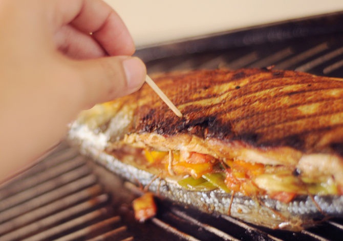 8. يمكنك إختبار إذا كانت السمك تم طهيه جيداً أم لا بإدخال إذا إنزلقت بسهولة داخل السمك ، تأكد من أنه تم طهيه جيداً و يفضل رفعه من علي النار قبل أن يحترق .