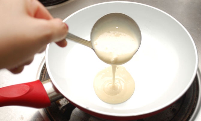 ثم إعادة وضع المقلاة علي النار حتي يصبح الجزء العلوي من الكريب يبدو جاف و الجزء الأسفل ذهبي فاتح .