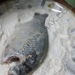 3- قومي بإزالة التتبيلة الموجودة على جسم السمكة ثم ضعيها و قومي بتغليفها بالدقيق من الجهتين ومن ثم ضعيها في طبق الماء ثانية واخرجها ثم وضعها في الدقيق ثانية وقومي بتغليفها من الجهتين وفورا الي الزيت الساخن وتكرار هذه الخطوات في جميع السمك الموجودة حتي تنتهي .