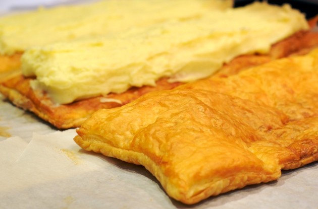 بمجرد أن يتم خبز رقائق المعجنات يمكنك البدء في الخطوات الأخري و هي تزيين الملفيه و الحشو . و ذلك بوضع الكريمة بالتساوي علي قطعين من رقائق المعجنات .