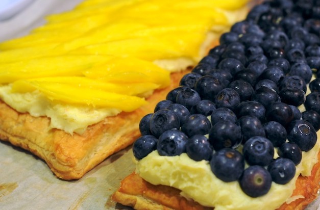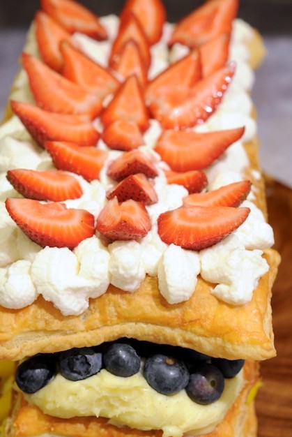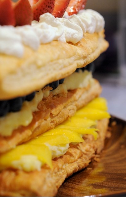 و بعد ذلك جهزي الفاكهة الموجودة معك ، بتقطيع المانجو إلي شرائح رقيقة و التوت و الفراولة أيضاً . ضعي شرائح الفاكهة التي قومتي بتقطيعها فوق الكريمة الموجودة أعلي رقائق المعجنات . بحيث يكون لديكي طبقة من الكريمة و أحد الفاكهة نحن هنا بدأنا بوضع الكريمة مع المانجو و الطبقة الثانية الكريمة و التوت .