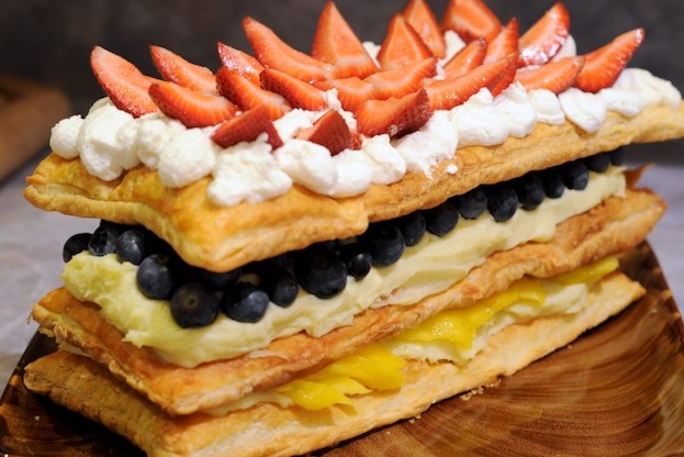 حضرى معنا اليوم حلوى مميزة لعائلتك وهي الملفيه إليك سيدتي طريقة عمل الملفيه بالمانجو والفراولة فمن المعروف بأن الملفيه من الحلويات الكلاسيكية التي تأتي بنفس الأشكال و الأحجام تقريباً و مجموعة من الطبقات المقرمشة و المحشو بمختلف النكهات و نحن اليوم إختارنا لكي سيدتي ملفيه المانجو و الفراولة و التوت لن تندمي علي تجربة هذه الوصفة .