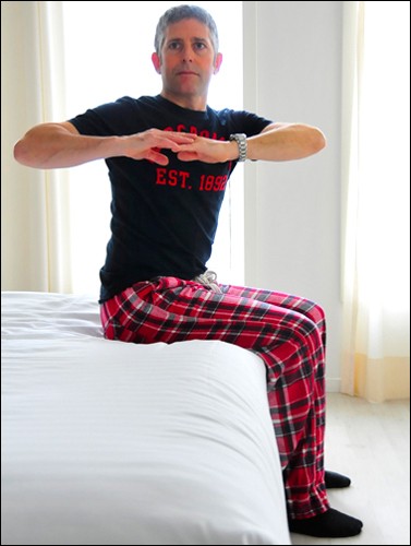 قم بالجلوس علي السرير و وضع القدمين بجانب بعضها البعض مع العمل علي ضم الذراعين معاً و فردهم أمامك جيداً إلي أقصي مسافة و أخذ نفس عميق ثلاث مرات .