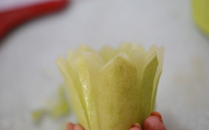 تقطيع أوراق الوردة : يفضل عمل ورق رقيق ، يتم التقطيع أفقي لجميع أجزاء قطعة الخيار .و عند التقطيع تأكد من إفراغ داخل الخيار قبل التقطيع و وضعه علي جانب مع القشر . بمعني تجويف الجزء الأوسط من الخيار بسكين التقشير.