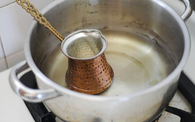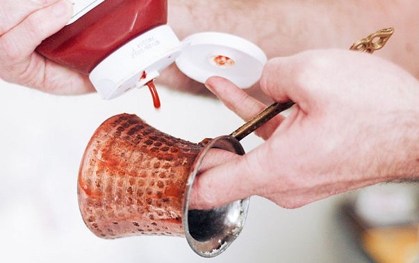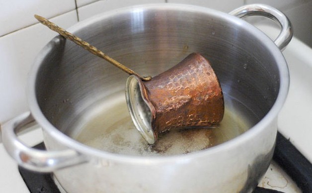 - ترك الخليط حتي يغلي ،، و يستمر في الغليان و تقليب قطعة النحاس الموجودة في الخليط .
